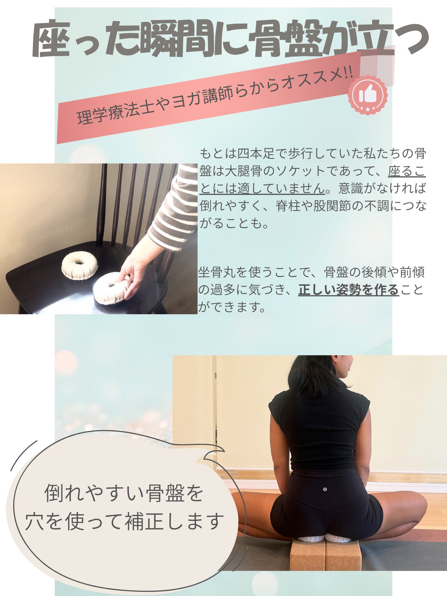 姿勢の崩れに自分で気づき、良い姿勢を保持するコアマッスルを日常生活の中で鍛えるために開発された骨盤サポート器具。丸い穴に坐骨をフィットさせることで、骨盤が自然に立ち、理想的な姿勢へと導きます。