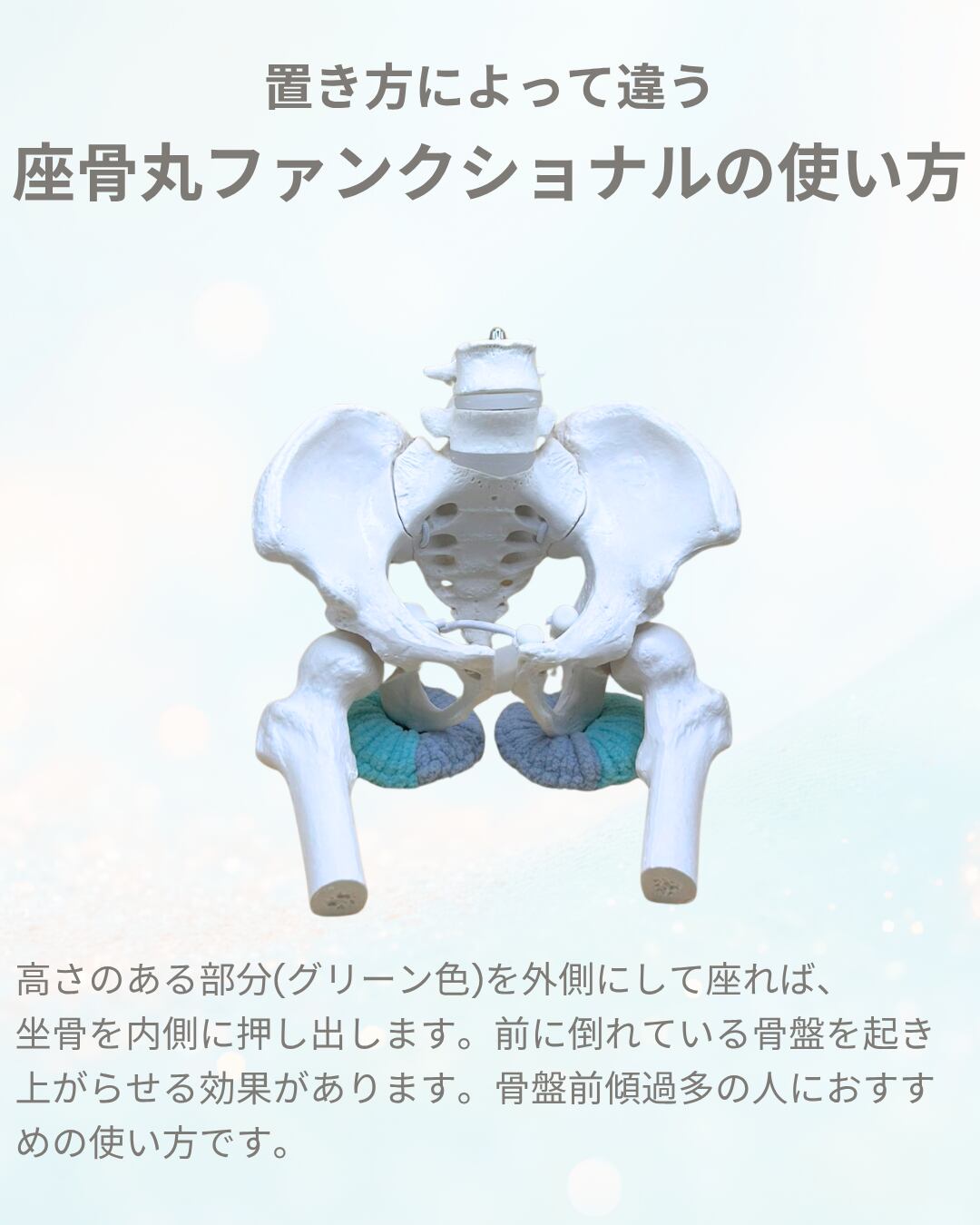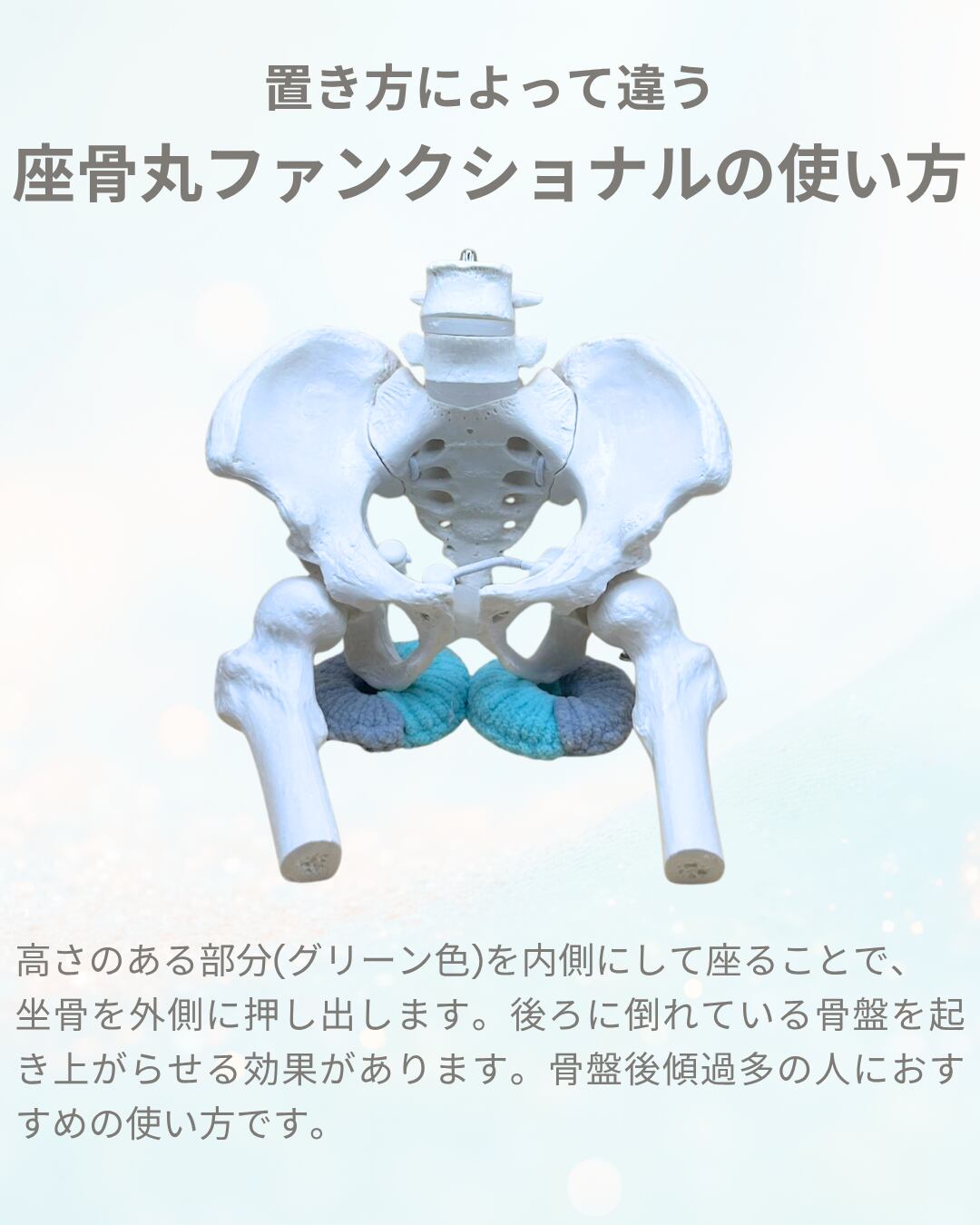 心地よい姿勢を実現する「坐骨丸(Y-M/M-R-FM)」の進化版。置き方によって高く盛り上がったエリアが坐骨に直接働きかけ、動かします。坐骨間の距離が近すぎていることで骨盤後傾が起きている方なら、内側に厚みのある部分をセット。座ることで、坐骨が内側から外側へと押し出され、後傾過多が改善されます。ヨガやボディーワーク経験がなく、自分で骨盤のポジションがわからなくても、実際に座ることで快適な置き方が見つかります。